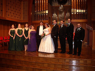 We ascended the stairs and I tried to hide. I didn't want Jason to see me through the big windows. The girls went down the aisle one by one. I was so excited that I was tingling. We moved up, big windows be damned. I see Hayden and Xavier going down the aisle, and I see my very soon to be husband. He looks so handsome standing there. The organist is playing the bridal march, and I am blind from a million camera flashes. The next part is all spotty in my mind. It was one of those things where emotion overrides memory. I really hate that. I remember my Dad almost crying and me saying told ya. I remember all of the groomsmen making funny faces because Xavier was wreaking havoc behind me. Most of all I remember almost crying myself while I was saying the vows. Jason raised my veil and kissed me. I think I was floating. I was so happy and really couldn't (still can't) believe that I was married. The best part of the whole thing was the Gordon Pipers. At the very end of the ceremony, I didn't know if they were there. I did a quick check, and I saw kilts. They came down the aisle and led us out. It was AWESOME. They were so so so good. Then we went and had a receiving line. Greeted everyone. Took pictures. Got in limo and went to the reception.